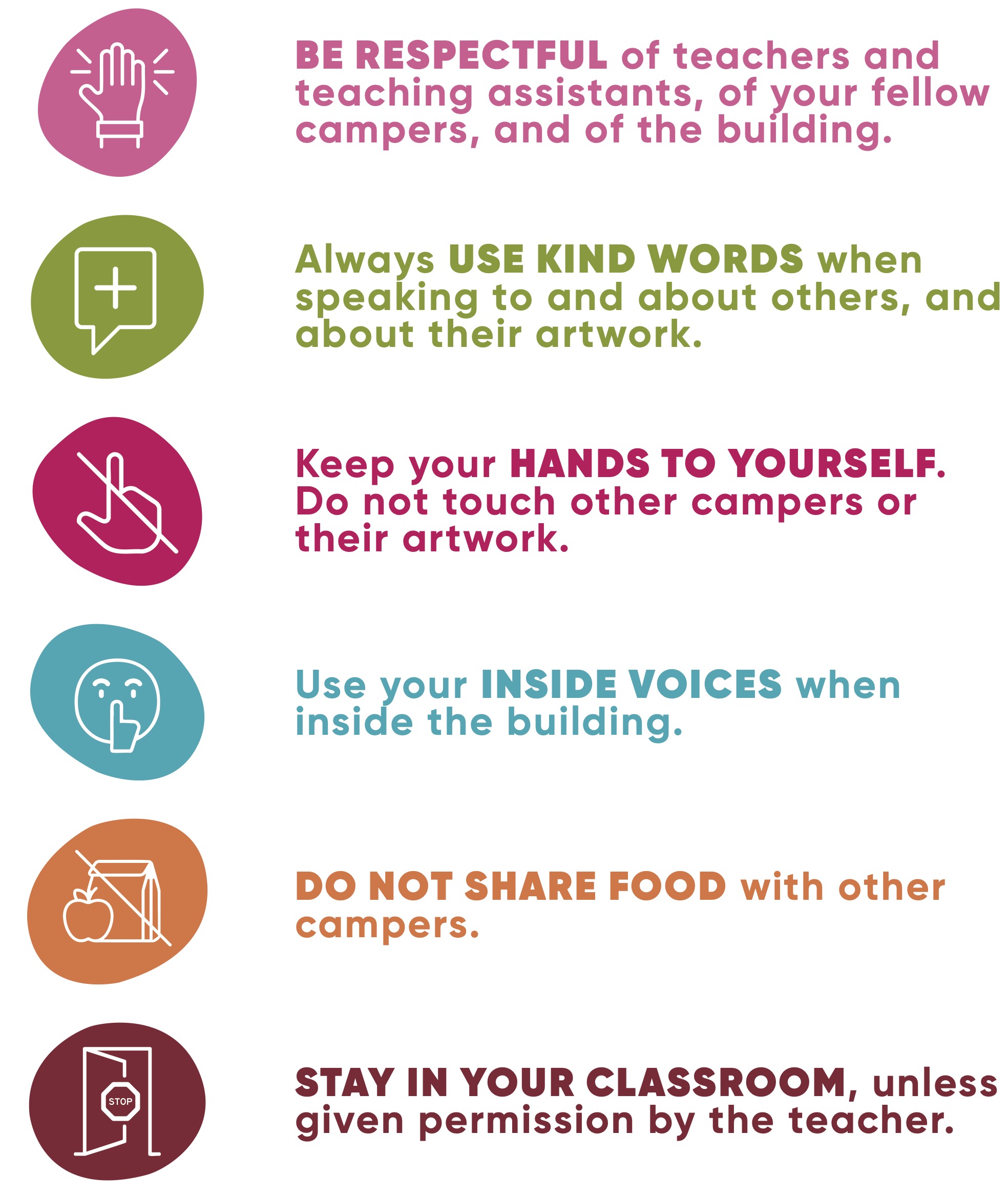 Please review the expectations and disciplinary consequences below with your camper prior to the first day of camp. These rules guide the program and ensure that every child has a fun camp week!
